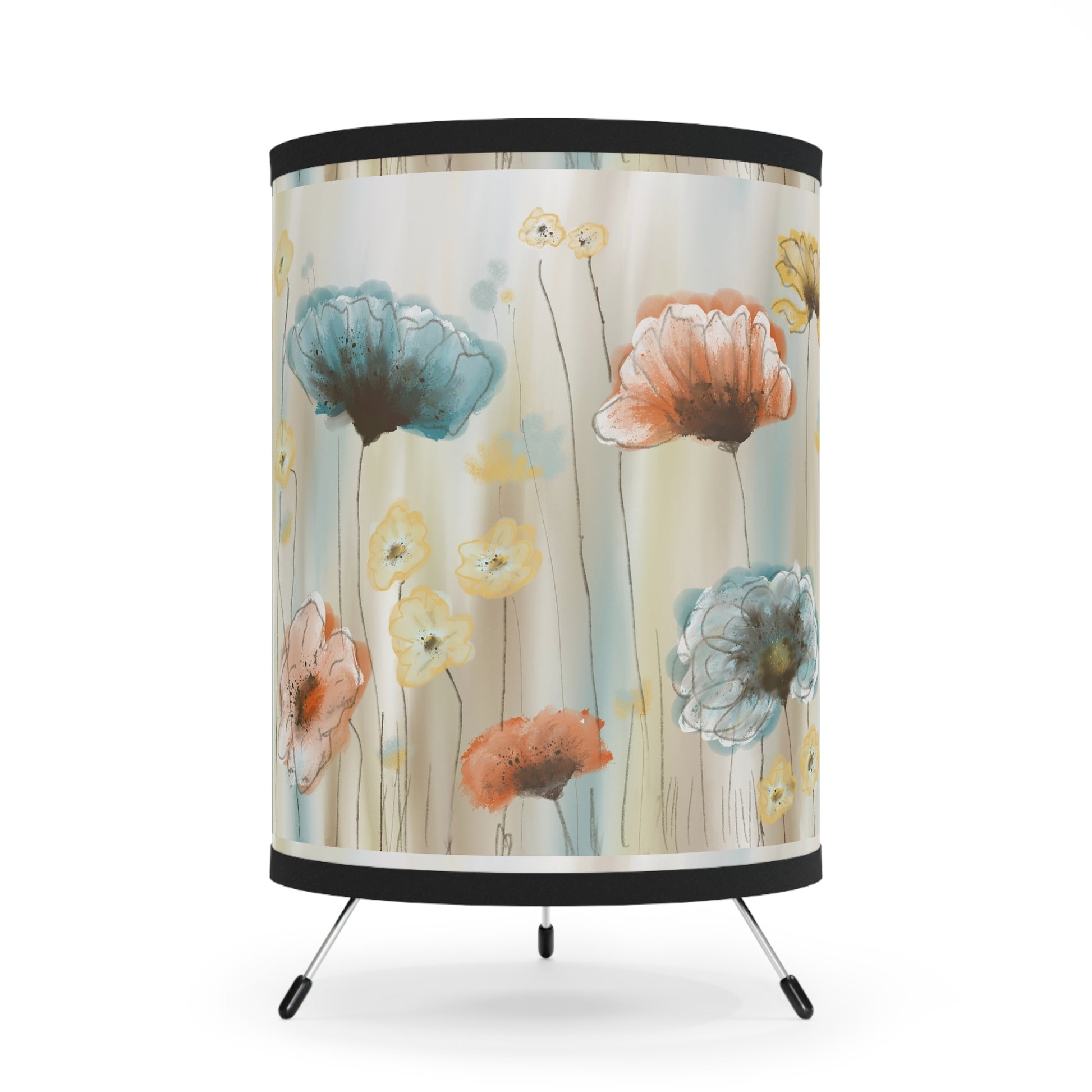 Soft, painterly blooms wrap this tripod lamp in a gentle, cottage-core glow. The high-resolution printed polyester shade shows watercolor poppies in muted corals, soft teals, and buttery yellows that diffuse light into a warm, calming wash. On its slim galvanized steel tripod, the lamp reads as both art and ambient lighting — a cozy anchor on a bedside table, a reading nook companion, or a quiet accent for a sunlit corner. The fabric trim and 360° print keep the design vivid from every angle, while the Type A plug and common bulb compatibility make it simple to set up and start enjoying the mood it creates.